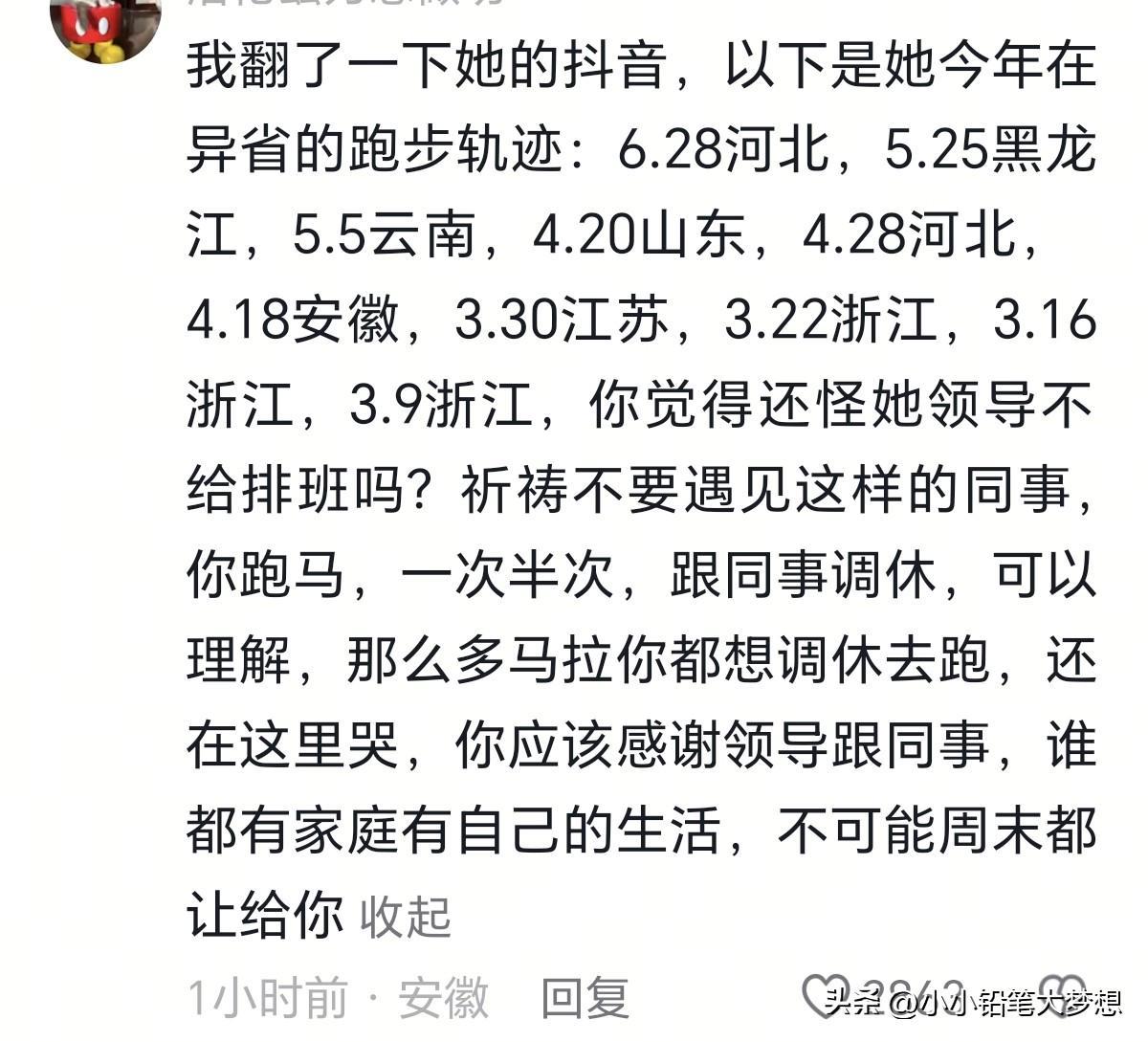 而从她的抖音个人账号里面看全国各地的马拉松比赛她都有安排,且几乎每个周末都在参赛,全国各地到处跑,意味着她要花大量的时间奔赴现场,其中最耗时间的还是平时要花大量的时间拉练。