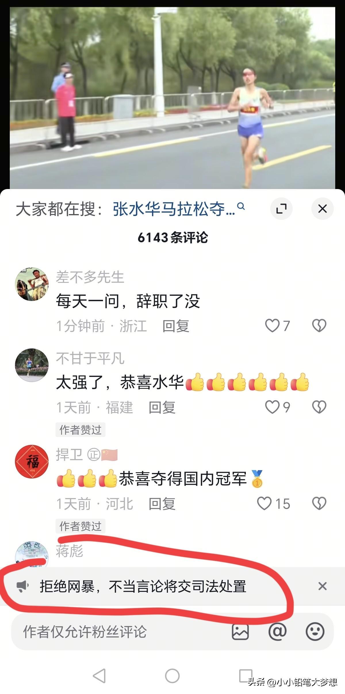 由于吐槽领导没有帮冠军调休参加马拉松比赛试图绑架同事,大量的网友涌进她个人账号的评论区评论,目前她的账号评论已经被关了,刚开始的时候还设置了“拒绝网暴,不当言论将交司法处置!”试图让网友消停下来。