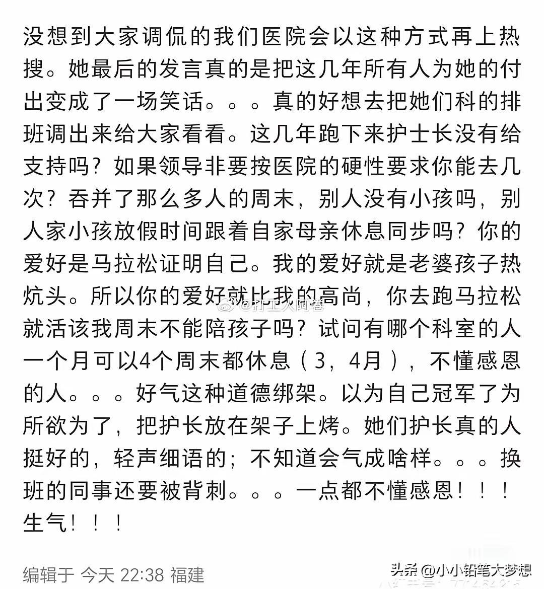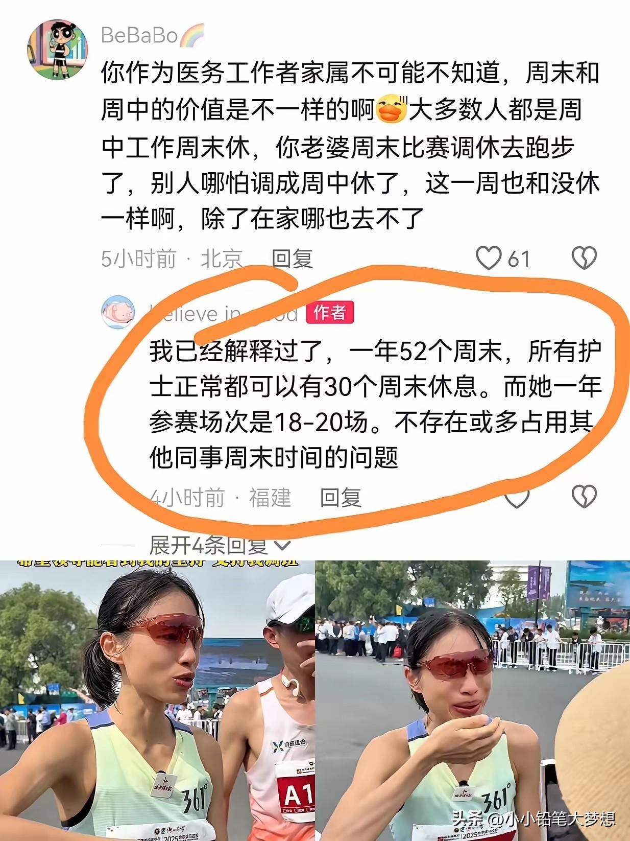 众所周知,护士工作很特殊经常要倒班,一个萝卜一个坑,没有闲散人员,几乎没有正常的周末,而且每个医生和护士的排班通常都要提前一个月安排,没有人愿意在周末加班,因为医院一般周末都比较忙,而且大家也想要在周末陪陪孩子,陪陪老人。如果让同事帮忙调休,那么就意味着有同事白班夜班可能要接着上。而且护士要求特别细心,但人的精力是有限的,本来跑马拉松就是非常高强度的运动,如果要想得到冠军那必须是全力以赴,那就意味着她把所有的精力都投放在马拉松上,那工作上是不可能100%兼顾的,有可能是会有漏洞。